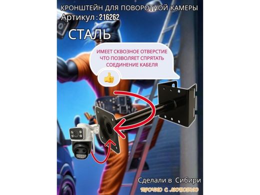 - Кронштейн для крепления видеокамеры на столб имеет сквозное отверстие, что позволяет спрятать соединения кабеля, тем самым защищает их от внешних воздействий (дождь, снег, ветер) поэтому нет необходимости использовать дополнительный гермобокс, т.к. разъемы спрячутся в трубе.