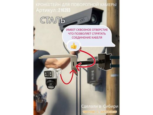 - Кронштейн для крепления видеокамеры на столб имеет сквозное отверстие от основания до козырька, что позволяет спрятать соединения кабеля, тем самым защищает их от внешних воздействий (дождь, снег, ветер) поэтому нет необходимости использовать дополнительный гермобокс, т.к. разъемы спрячутся в трубе.