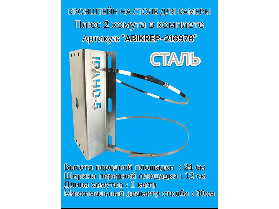 Кронштейн оцинкованный для камеры видеонаблюдения с хомутами на столб "ABIKREP-216979" 24х12см, 2отв