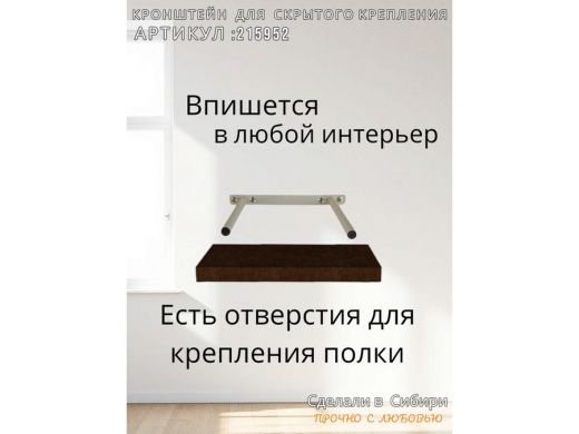 - Кронштейн предназначен для скрытого крепления полок, изготовленных из различных материалов: МДФ, ДСП, дерево, пластик.