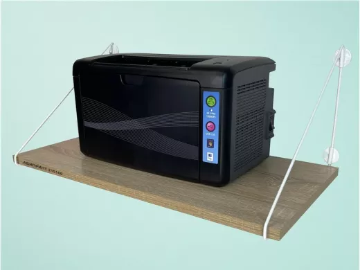 - Полка надежно крепится к стене при помощи анкеров или шурупов с дюбелями, на ней можно разместить принтер, бумагу и многое другое