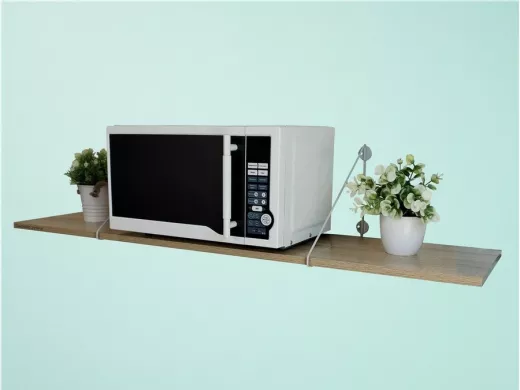 - Полка надежно крепится к стене при помощи анкеров или шурупов с дюбелями, на ней можно разместить микроволновую печь, кухонную технику, посуду, специи