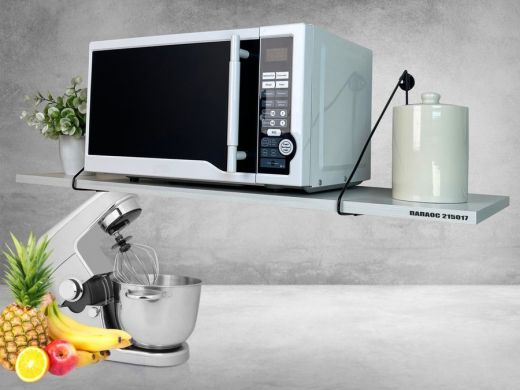 - Полка надежно крепится к стене при помощи анкеров или шурупов с дюбелями, на ней можно разместить микроволновую печь, кухонную технику, посуду, специи
