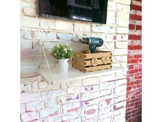 Полка надежно крепится к стене при помощи анкеров или шурупов с дюбелями, на ней можно разместить микроволнрвую печь, кухонную технику, посуду, специи.