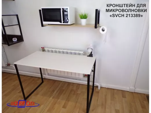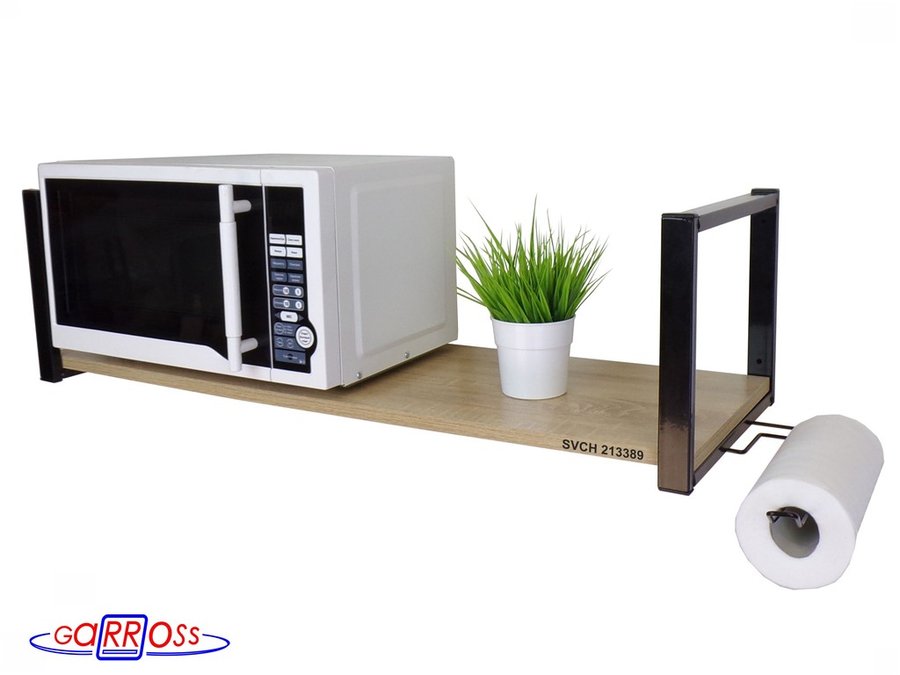 • Полка надежно крепится к стене при помощи анкеров или шурупов с дюбелями, на ней можно разместить микроволновую печь, кухонную технику, посуду, специи