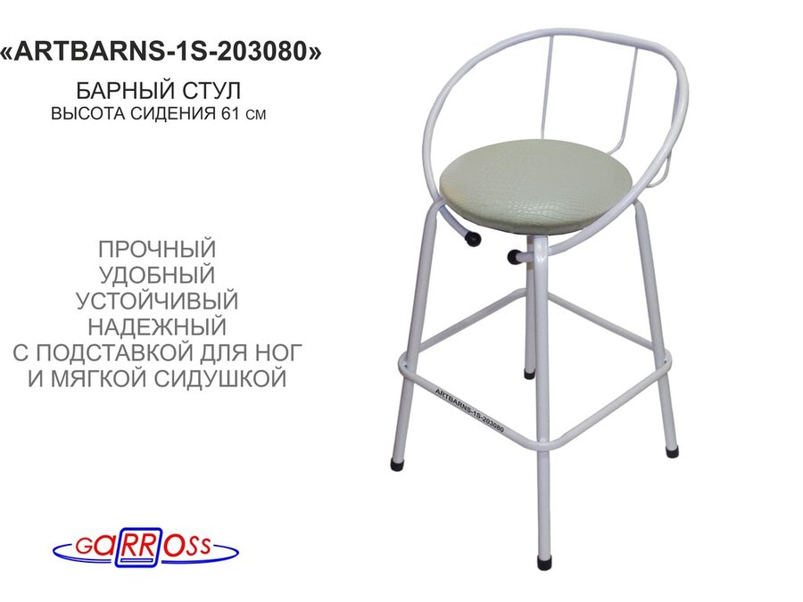 Барный стул "ARTBARNS-1S" органично дополнит интерьер модного заведения или домашней кухни. Стильная модель высотой 0,61 метра устойчиво стоит на четырех опорах с удобными подножками.