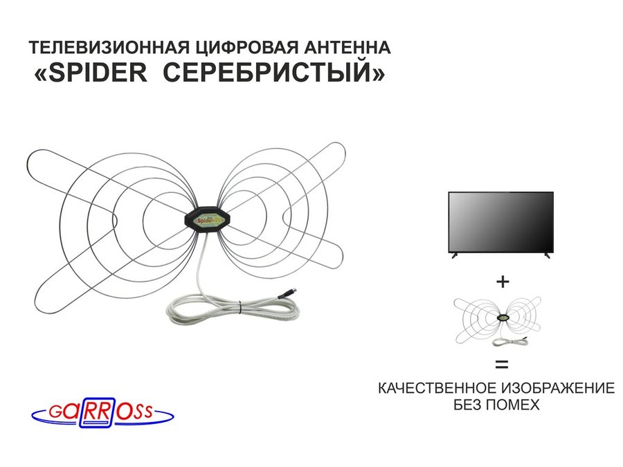 В корзину Купить в 1 клик "SPIDER СЕРЕБРИСТЫЙ" антенна цифровая телевизионная DVB-T2, МВ/ДМВ, кабель 5метров