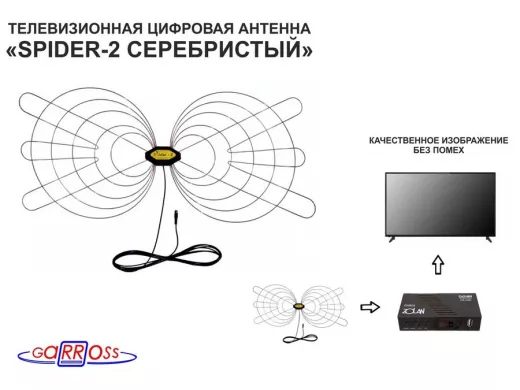 В корзину Купить в 1 клик "SPIDER-2 СЕРЕБРИСТЫЙ" антенна цифровая телевизионная DVB-T2, МВ/ДМВ, кабель 5метров
