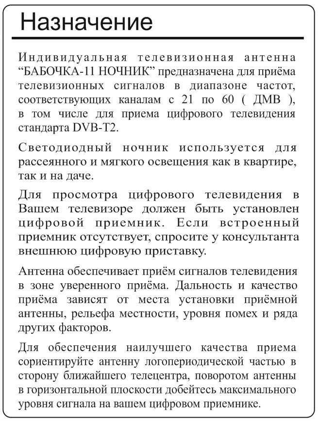 • "БАБОЧКА-11 НОЧНИК" С ПОДСВЕТКОЙ комнатная телевизионная антенна предназначена для приема цифрового DVB-T2 и аналогового телевизионного сигнала ДМВ диапазона
