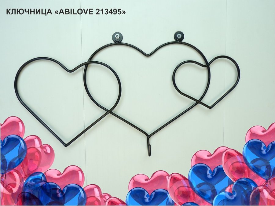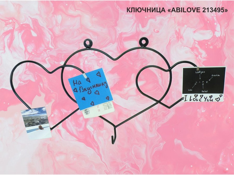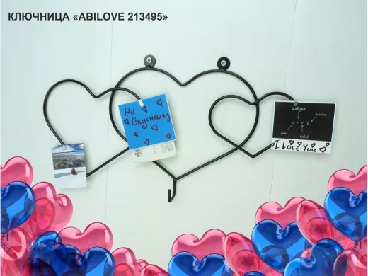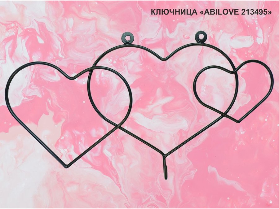 Ключница с крючком и 3 магнитами для записок и фотографий, 3 сердца,вешалка, чёрный "ABILOVE 213495"