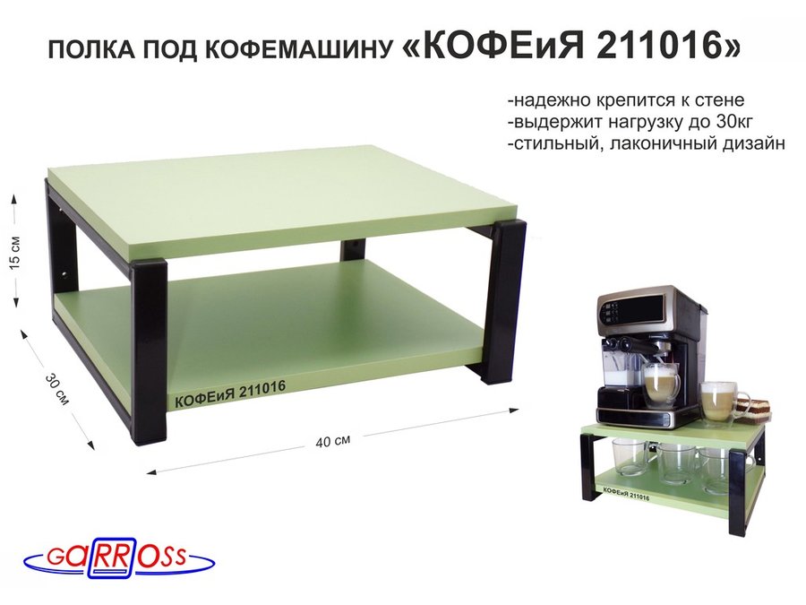 В корзину Купить в 1 клик Полка под кофемашину к стене, высота 17см, серый каркас "КОФЕиЯ 204524" полки 30х40см, салатовый