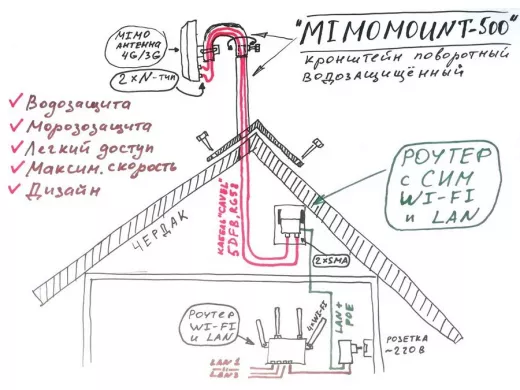 • Конёк крыши обычно является самым высоким местом здания, поэтому можно добиться наилучшего качества принятого сигнала, установив антенну в наивысшую точку