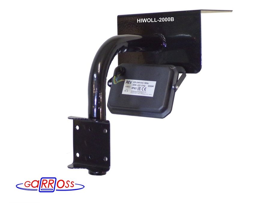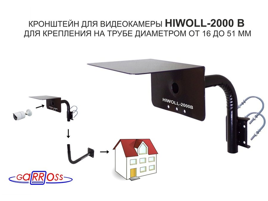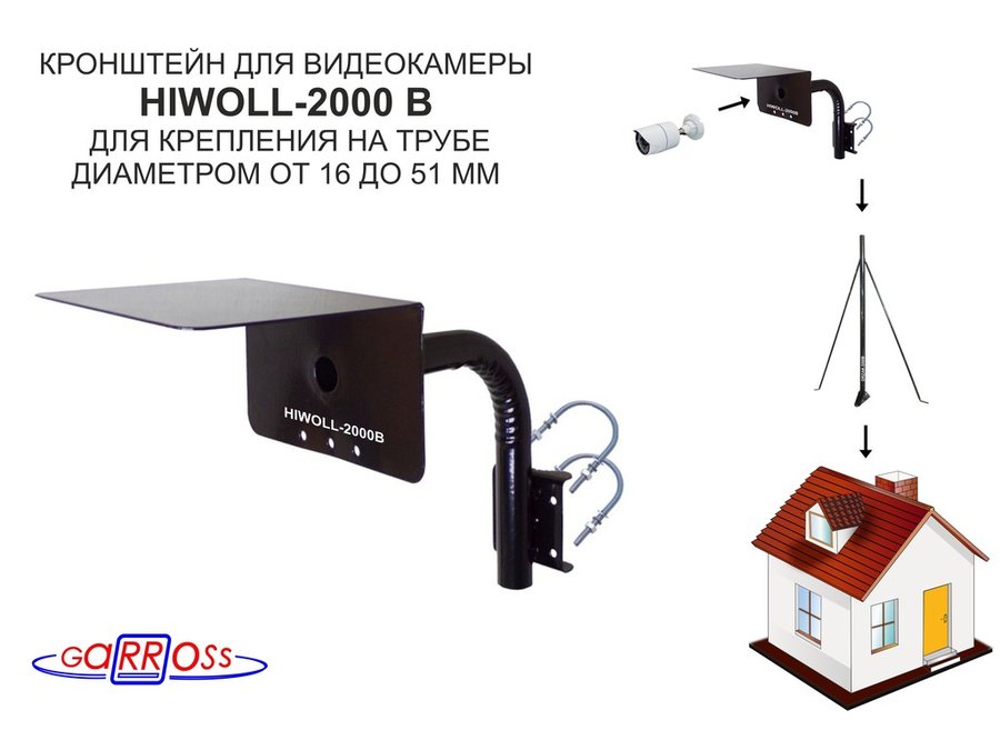 В корзину Купить в 1 клик Кронштейн "HIWOLL-2000B-121405" чёрный с хомутами и козырьком на мачту для видеокамеры и прожектора