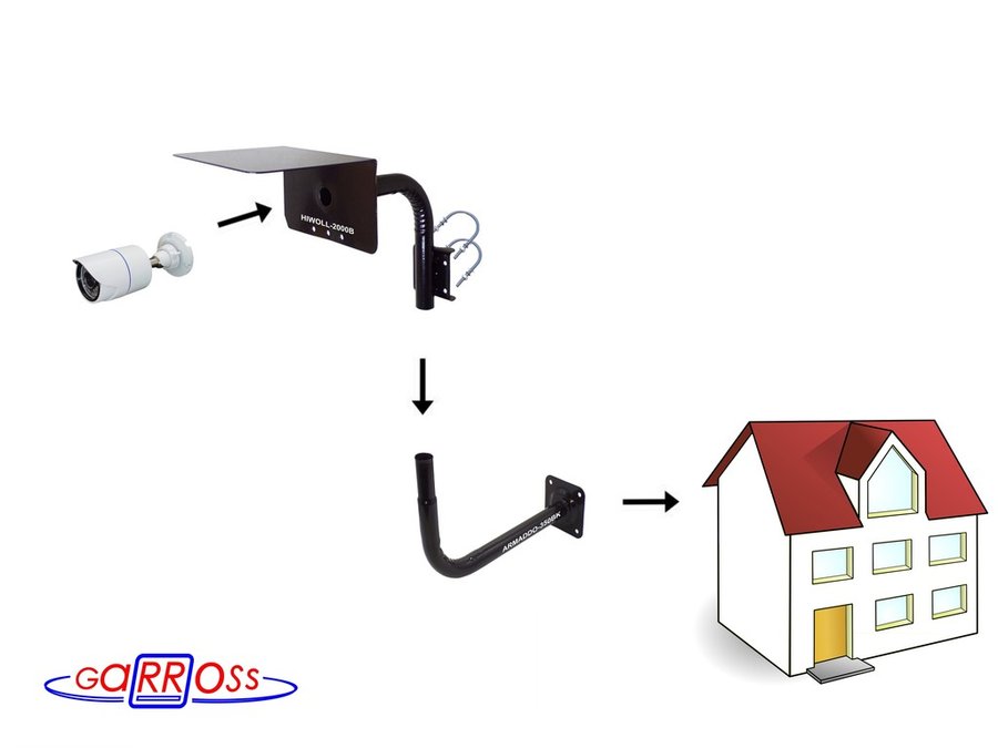 • Конструкция кронштейна имеет  сквозное отверстие у козырька (где крепится камера), что позволяет надежно спрятать соединения кабеля. Плотный, непрерывный сварочный шов позволяет защищать кабель от внешних воздействий (дождь, снег, ветер), что гарантирует защиту соединения между камерой и кабелями