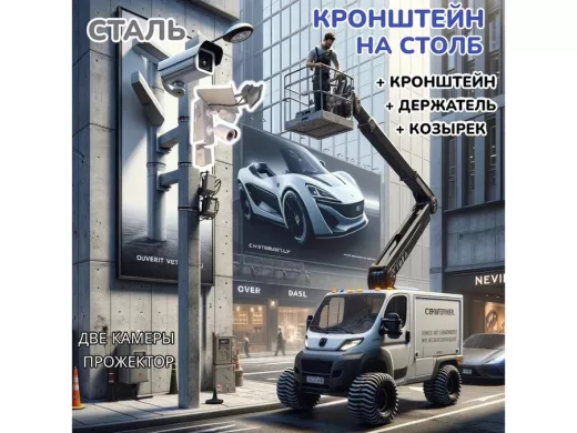 Кронштейн с козырьком и площадкой под монтажную коробку для крепления двух камер и прожектора на столб при помощи ленты или хомутов