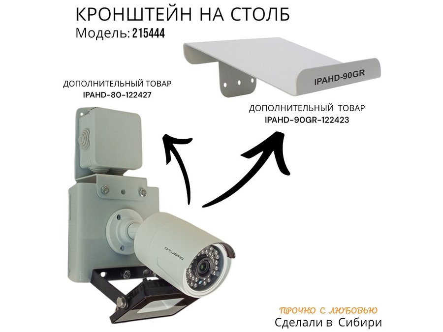 • Конструкция кронштейна позволяет крепить дополнительную опцию в виде разводной коробки, для укладки соединительных электропроводов от камеры и прожектора.