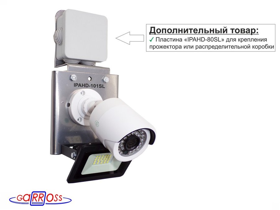 • Конструкция кронштейна позволяет крепить дополнительную опцию в виде разводной коробки, для укладки соединительных электропроводов от камеры и прожектора.