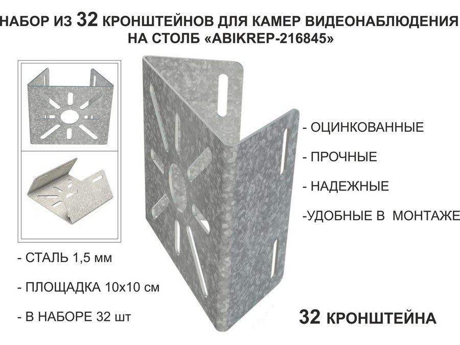 В корзину Купить в 1 клик Набор 32 шт. Кронштейн оцинкованный для камеры на столб "ABIKREP-216845" 100х104мм, сталь,под хомуты