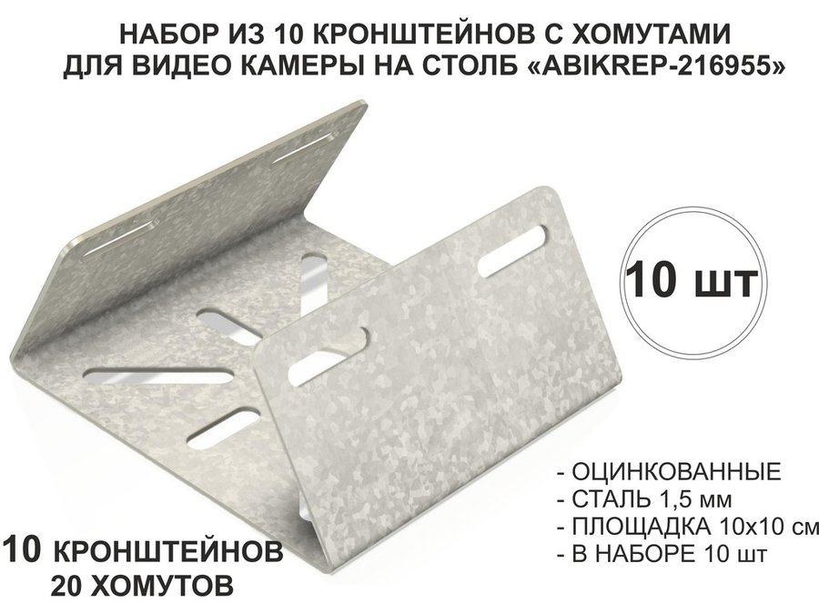 Набор 10шт. Кронштейн оцинкованный для камеры наблюдения с хомутами на столб "ABIKREP-216955"