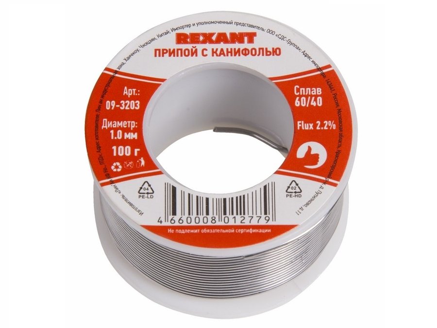 В корзину Купить в 1 клик Припой (катушка) с канифолью 100 гр. d=1.0 мм (Sn60 Pb40 Flux 2.2%) REXANT