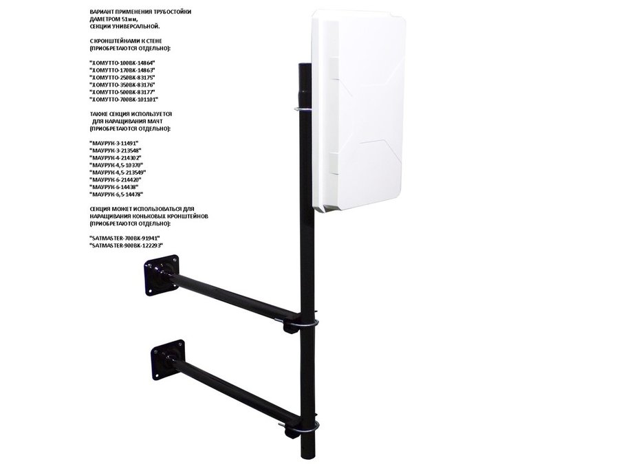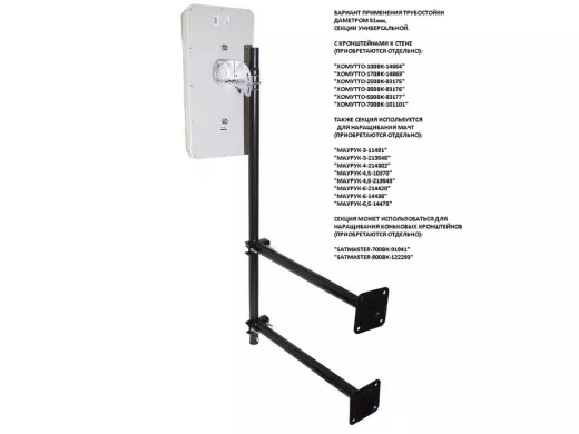 • Данную секцию можно использовать в качестве как нижнего звена мачты , т.к. в нижней части секции есть отвестия для установки подпятника, так и в качестве среднего или верхнего звена за счёт наличия болта для фиксации звена к звену на одном конце секции и обжатия трубы на другом конце. Также применяется с кронштейнами "ХОМУТТО"  для крепления к стене и на торец крыши анттенн, также подходит для коньковых кронштейнов серии "SATMASTER-700", "SATMASTER-900".
