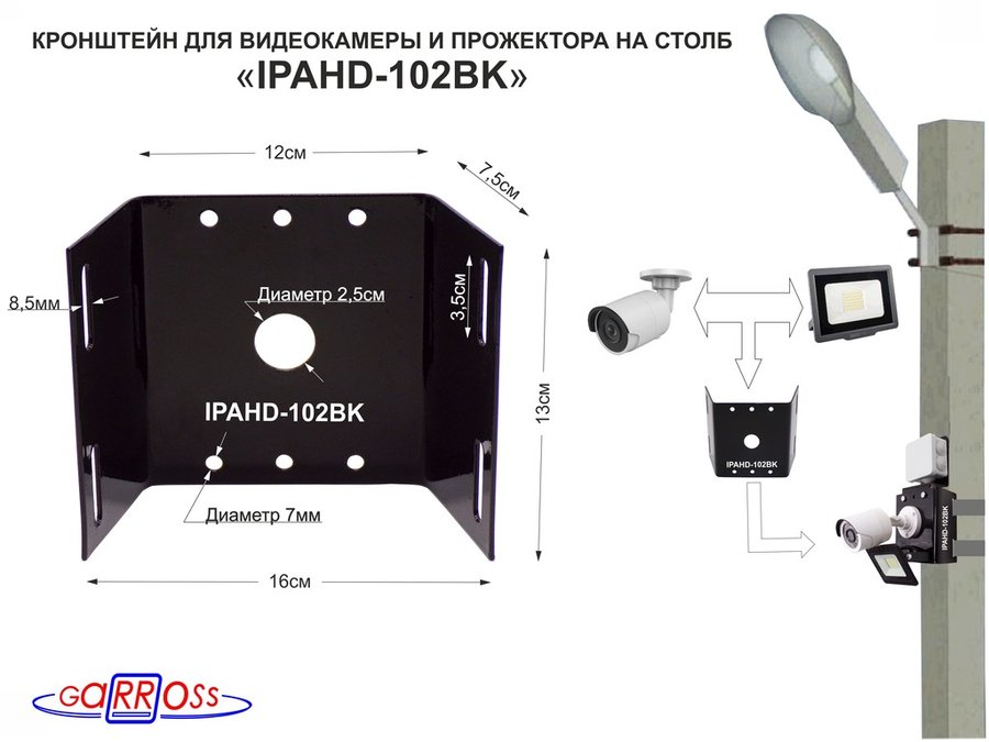 В корзину Купить в 1 клик Кронштейн "IPAHD-102BK" ЧЁРНЫЙ для 1 камеры и прожектора на столб СИП-лента, вылет 80мм,150мм