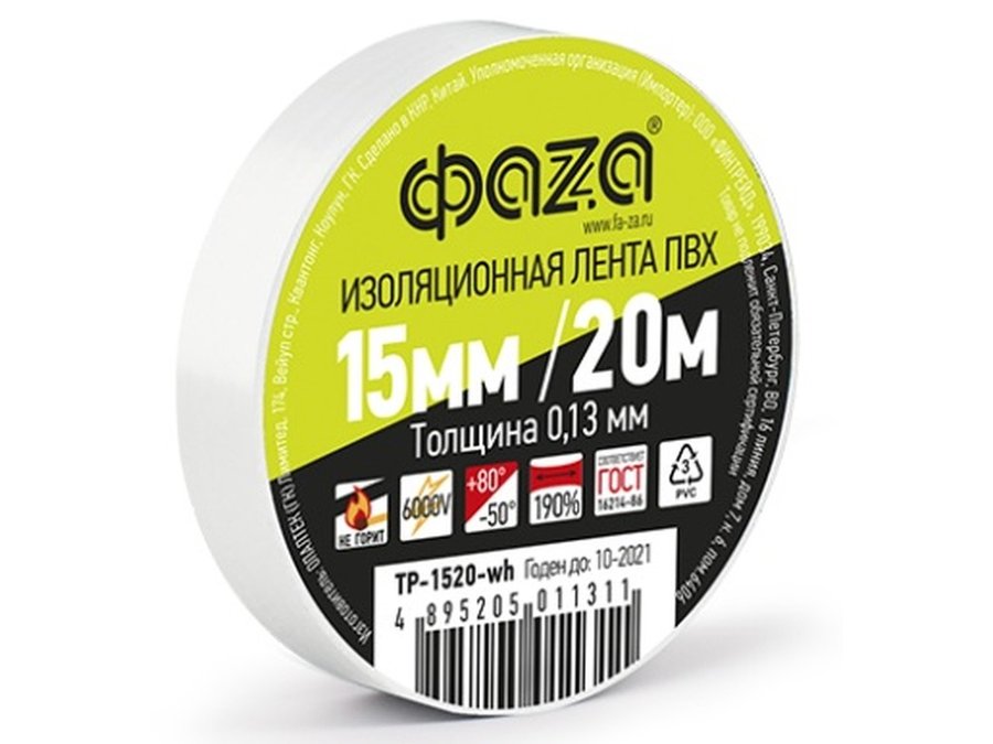 В корзину Купить в 1 клик Изолента 15мм х 20метров белая ФАZA ТР-1520