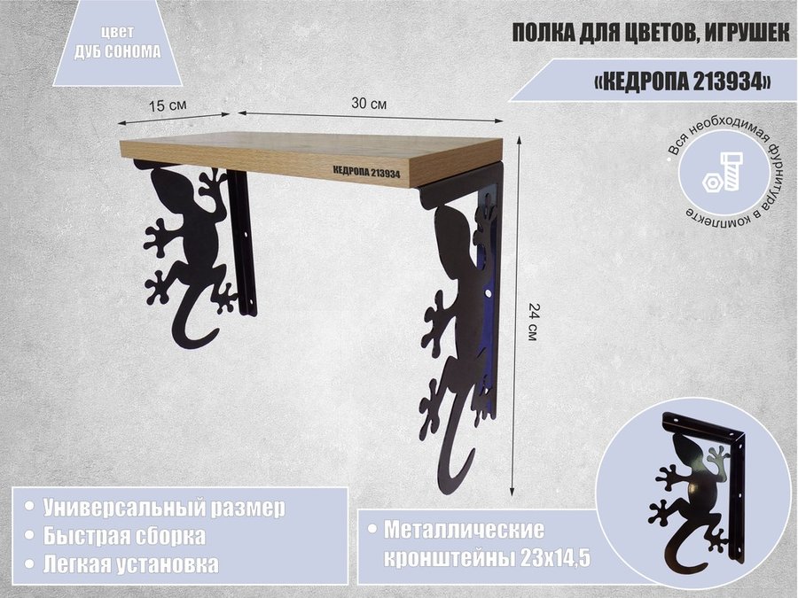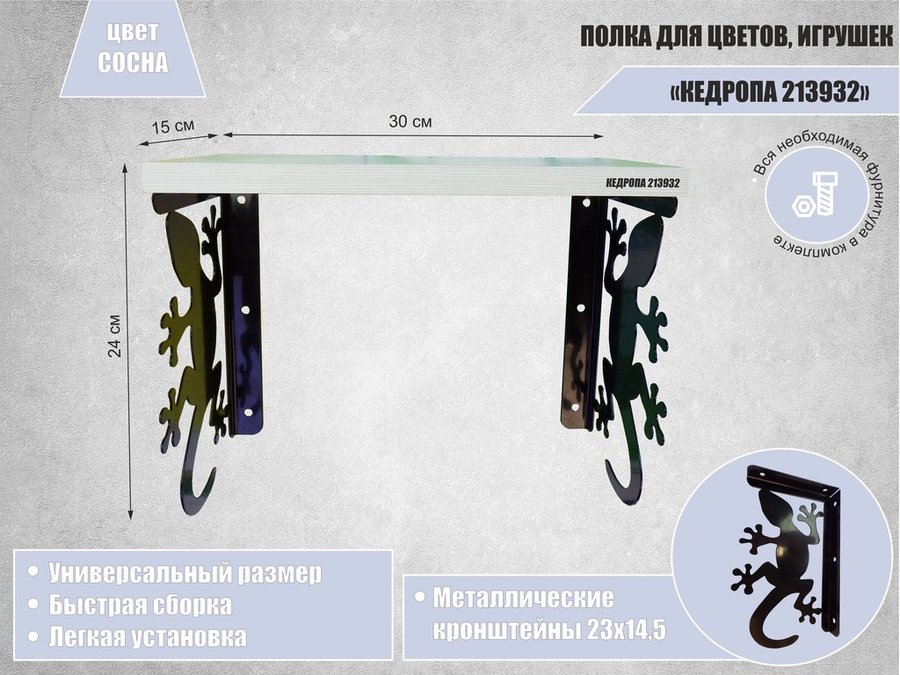 Полка для наград, кубков, медалей, грамот "КЕДРОПА-214045 гекон" размер 15х60х24 см, сосна с сердцем