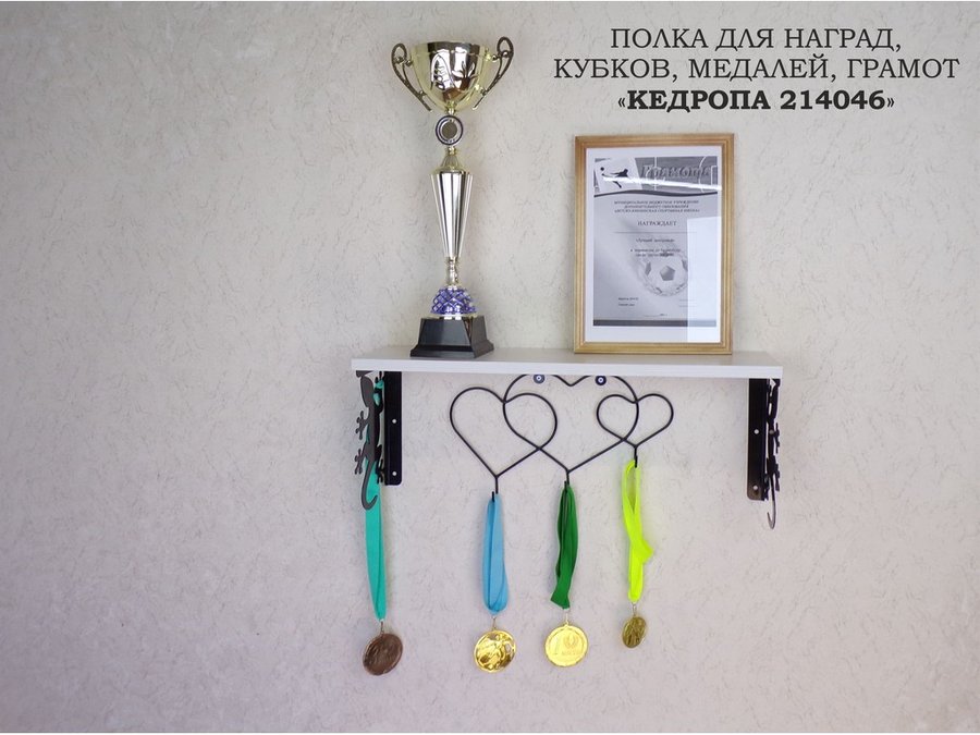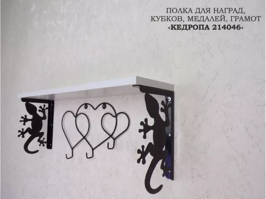 Полка для наград, кубков, медалей, грамот "КЕДРОПА-214046 гекон"размер 15х60х24 см, сосна с сердцами