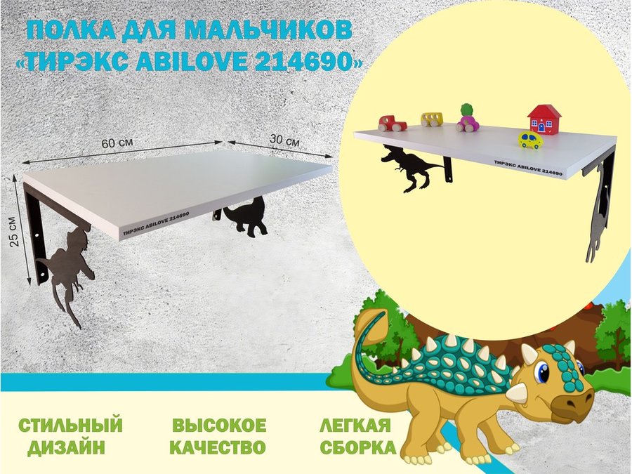 В корзину Купить в 1 клик Полка с динозаврами "ТИРЭКС ABILOVE-214690" для конструкторов, машинок, белый, 30х60см