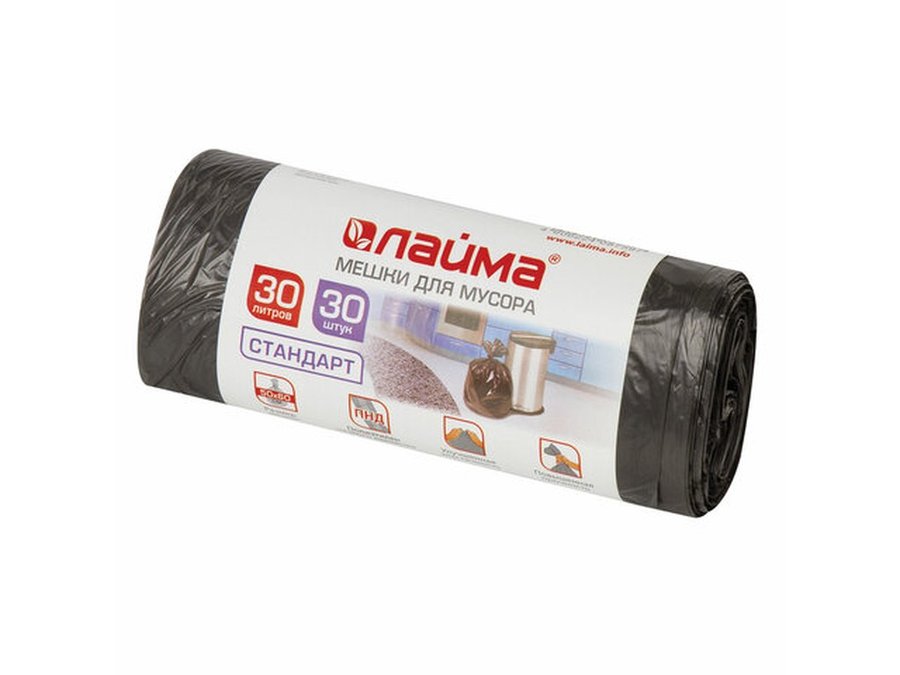 В корзину Купить в 1 клик Мешки для мусора 30литров, черные, в рулоне 30шт, ПНД, 8мкм, 50х60см(+5%), стандарт "BR-78283"