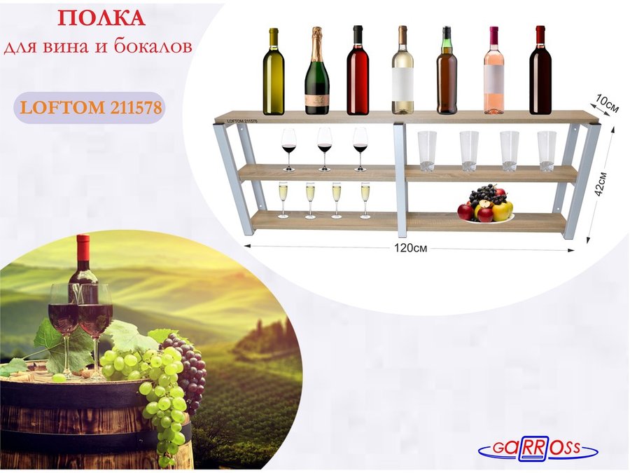В корзину Купить в 1 клик Полка для вина и бокалов, высота 42см, 3 уровня, размер 10х120см, серая "LOFTOM 211578" дуб сонома