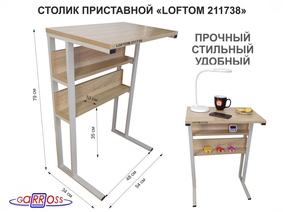 В корзину Купить в 1 клик Столик приставной, 79 см, серый "LOFTOM 211738" прикроватный стол журнальный с двумя полками, дуб