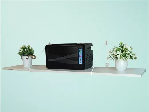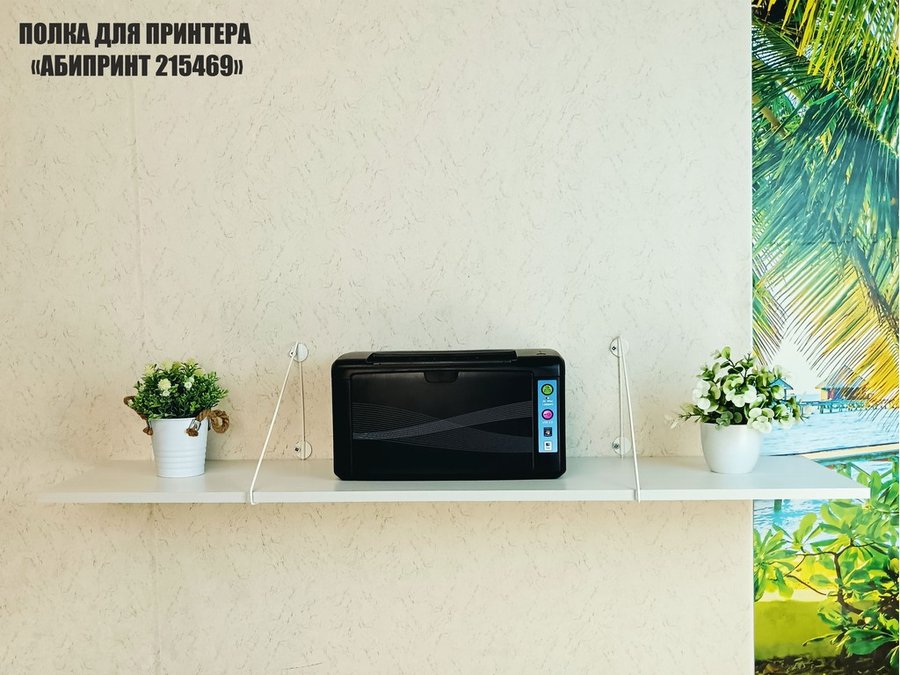 - Полка надежно крепится к стене при помощи анкеров или шурупов с дюбелями, на ней можно разместить принтер, бумагу