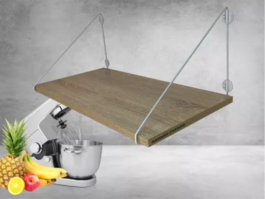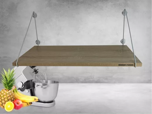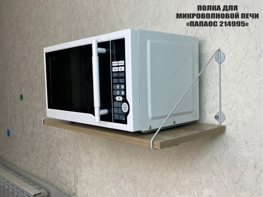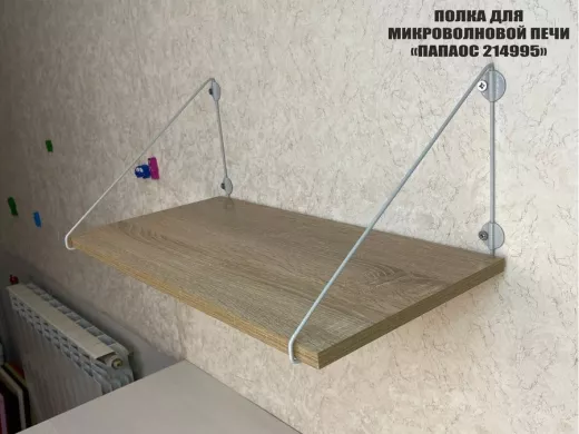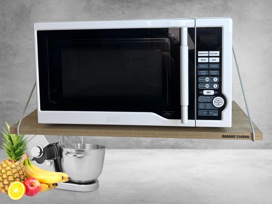 • Полка надежно крепится к стене при помощи анкеров или шурупов с дюбелями, на ней можно разместить микроволновую печь, кухонную технику, посуду, специи и многое другое
