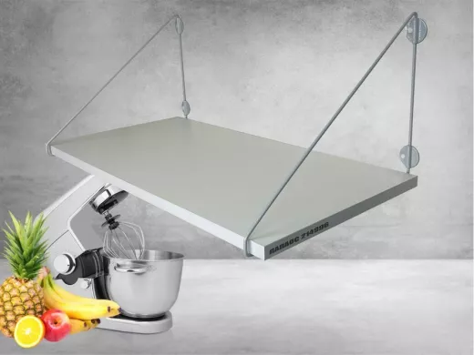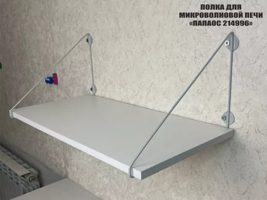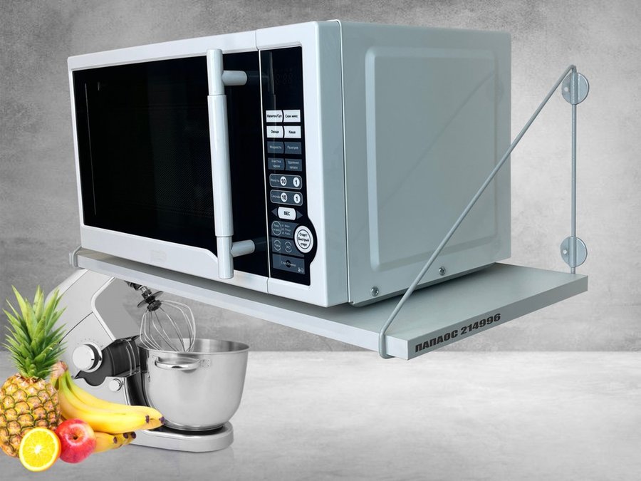 • Полка надежно крепится к стене при помощи анкеров или шурупов с дюбелями, на ней можно разместить микроволновую печь, кухонную технику, посуду, специи и многое другое