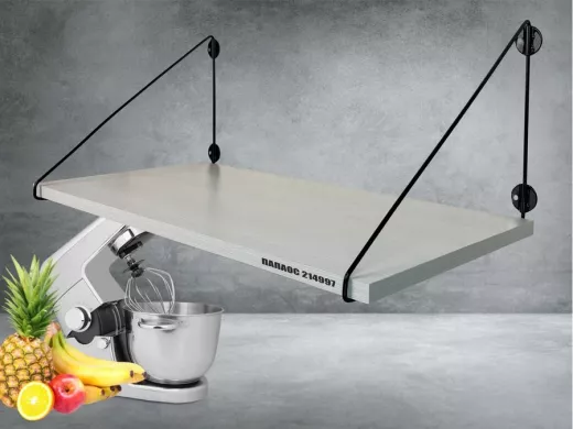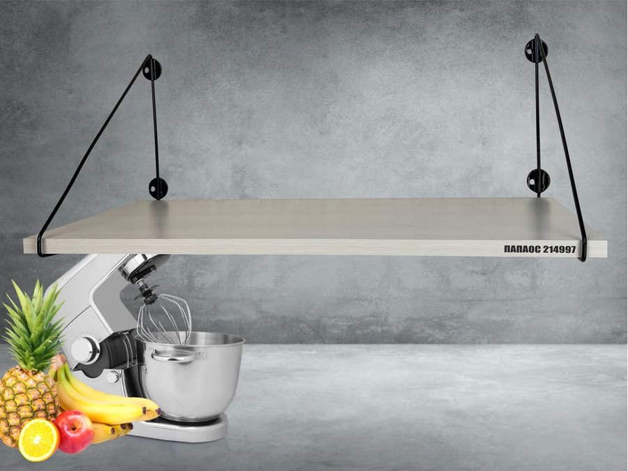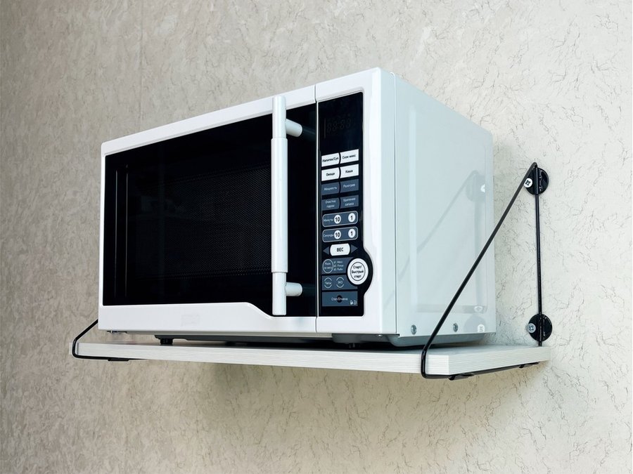 - Полка надежно крепится к стене при помощи анкеров или шурупов с дюбелями, на ней можно разместить микроволновую печь, кухонную технику, посуду, специи и многое другое