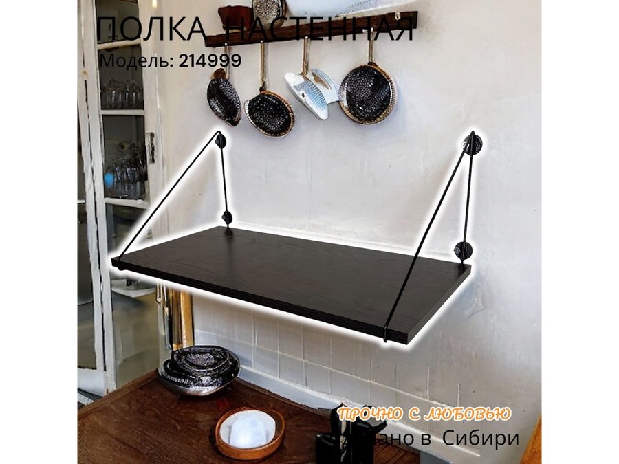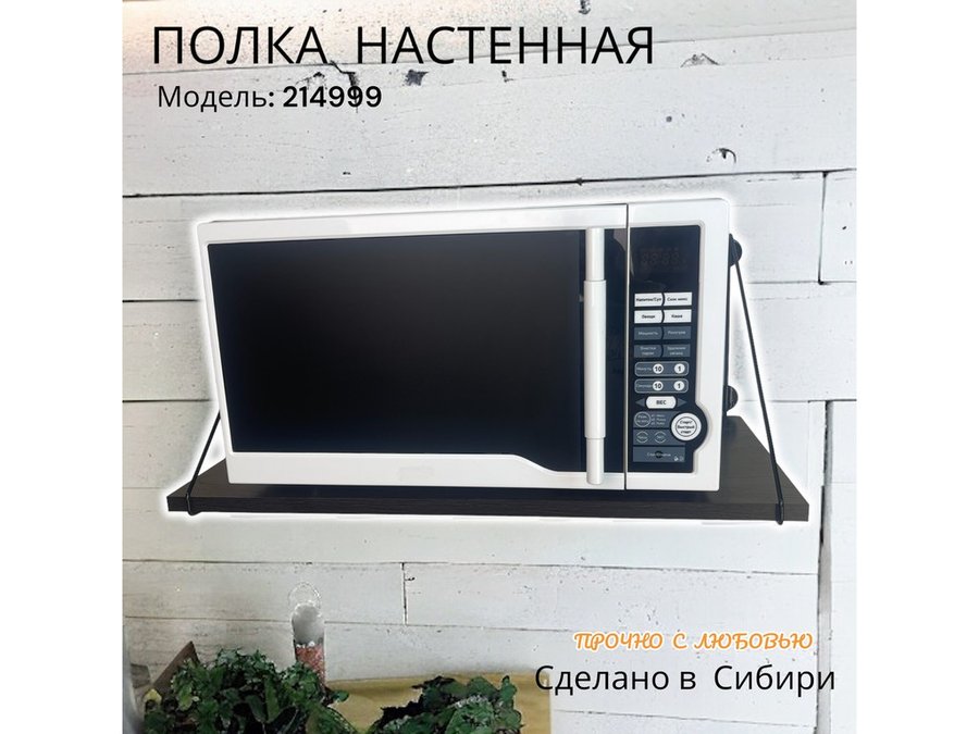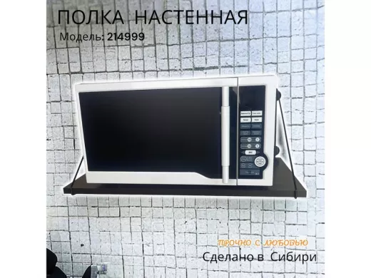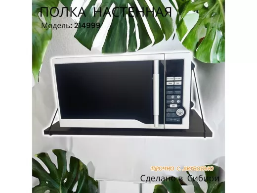 • Полка надежно крепится к стене при помощи анкеров или шурупов с дюбелями, на ней можно разместить микроволновую печь, кухонную технику, посуду, специи