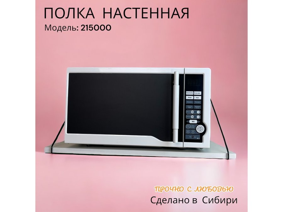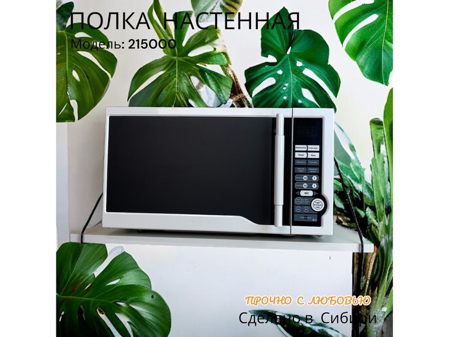 • Полка надежно крепится к стене при помощи анкеров или шурупов с дюбелями, на ней можно разместить микроволновую печь, кухонную технику, посуду, специи