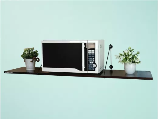 - Полка надежно крепится к стене при помощи анкеров или шурупов с дюбелями, на ней можно разместить микроволновую печь, кухонную технику, посуду, специи