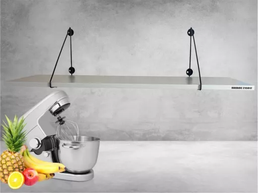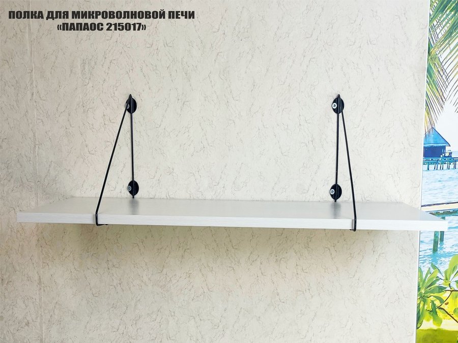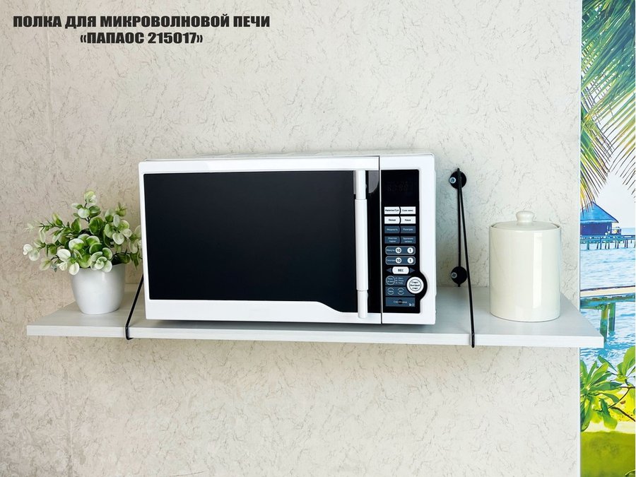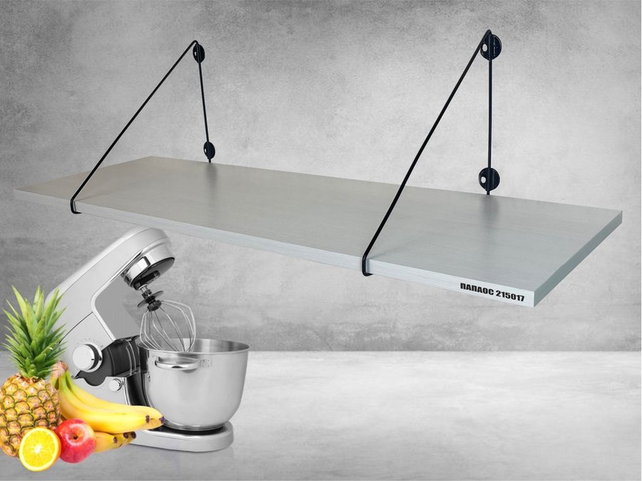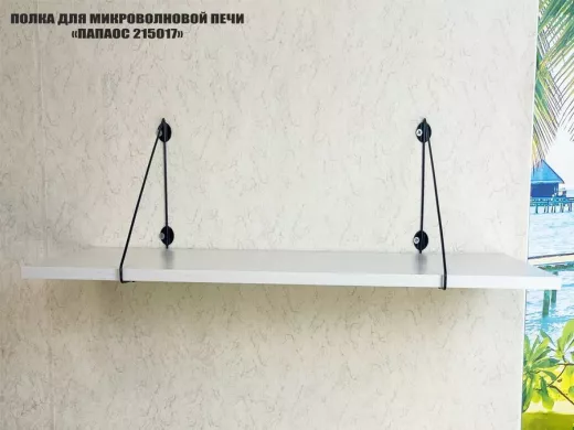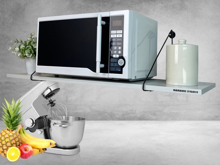 • Полка надежно крепится к стене при помощи анкеров или шурупов с дюбелями, на ней можно разместить микроволновую печь, кухонную технику, посуду, специи