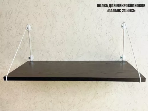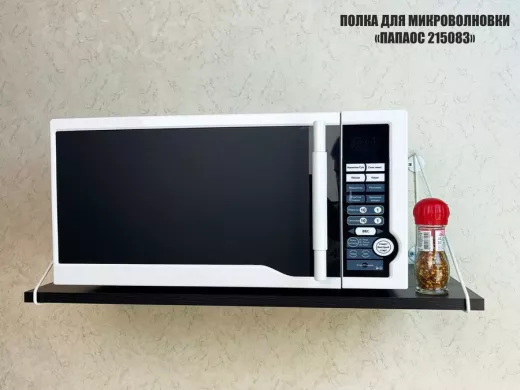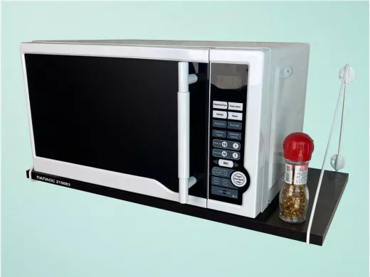 • Полка надежно крепится к стене при помощи анкеров или шурупов с дюбелями, на ней можно разместить микроволновую печь, кухонную технику, посуду, специи