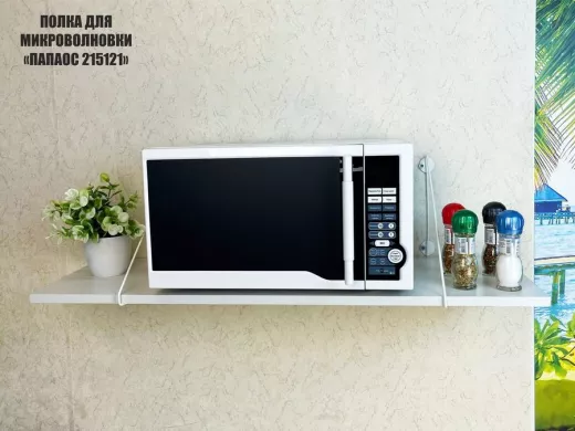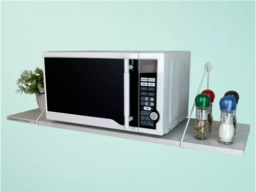 - Полка надежно крепится к стене при помощи анкеров или шурупов с дюбелями, на ней можно разместить микроволновую печь, кухонную технику, посуду, специи