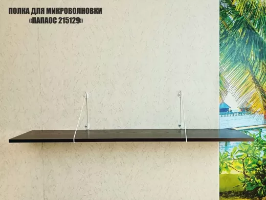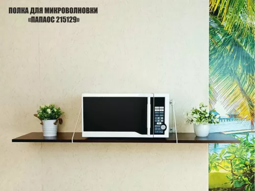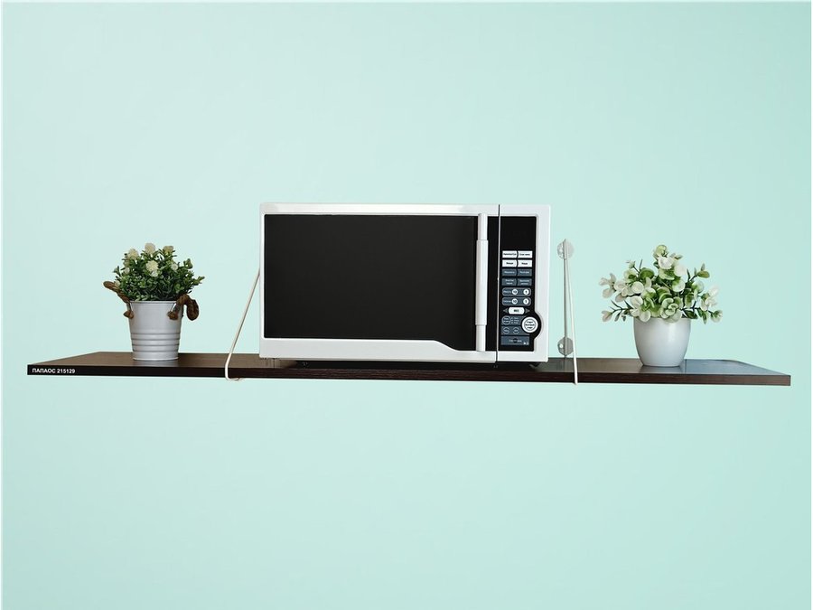 • Полка надежно крепится к стене при помощи анкеров или шурупов с дюбелями, на ней можно разместить микроволновую печь, кухонную технику, посуду, специи