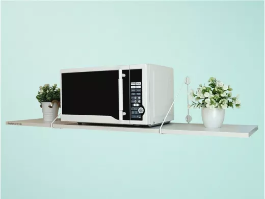 - Полка надежно крепится к стене при помощи анкеров или шурупов с дюбелями, на ней можно разместить микроволновую печь, кухонную технику, посуду, специи