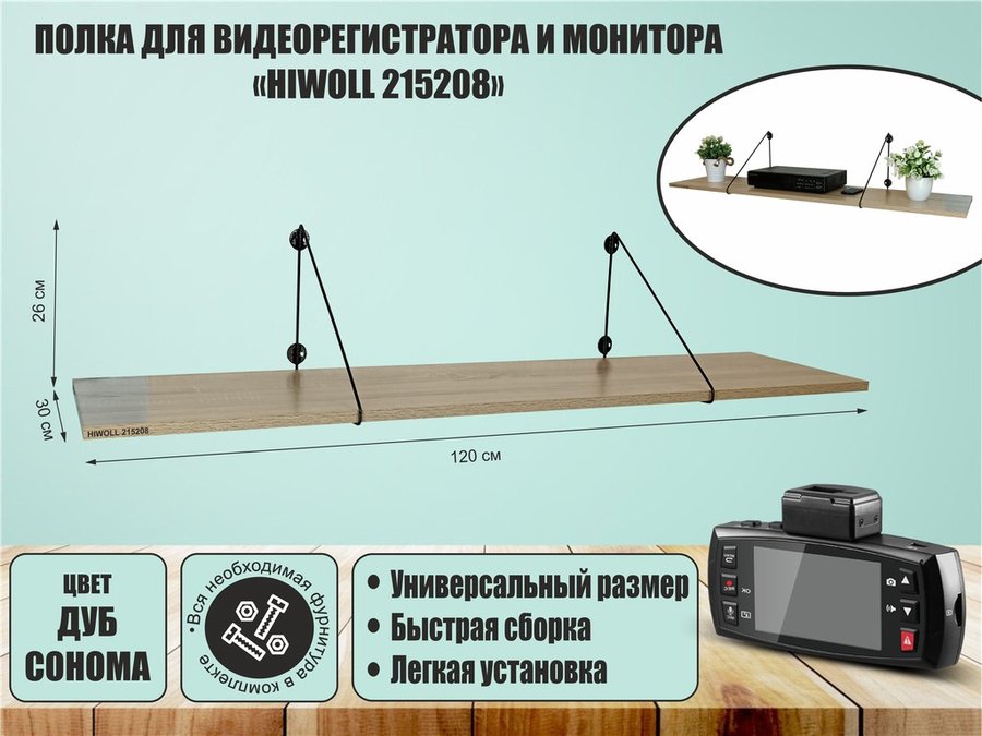 В корзину Купить в 1 клик Полка для видеорегистратора и монитора "HIWOLL 215210" высота 26 см размер 120х30 см черный и сосна