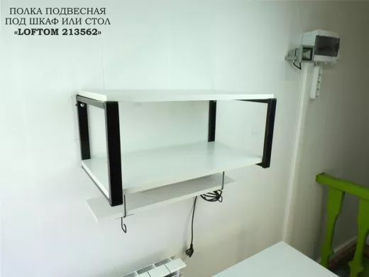 • Подвесная полка фиксируется под столешницей и может использоваться для размещения сетевого фильтра и проводов, чтобы они не мешали на столе или под столом. Также может быть использована на кухне - для хранения специй, стаканов, баночек и тд.