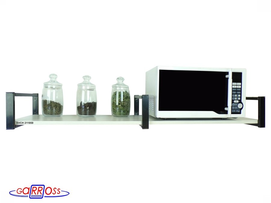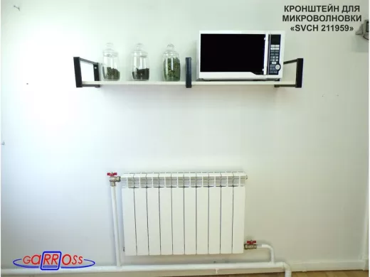 • Полка надежно крепится к стене при помощи анкеров или шурупов с дюбелями, на ней можно разместить микроволнрвую печь, кухонную технику, посуду, специи