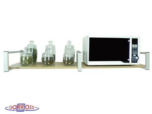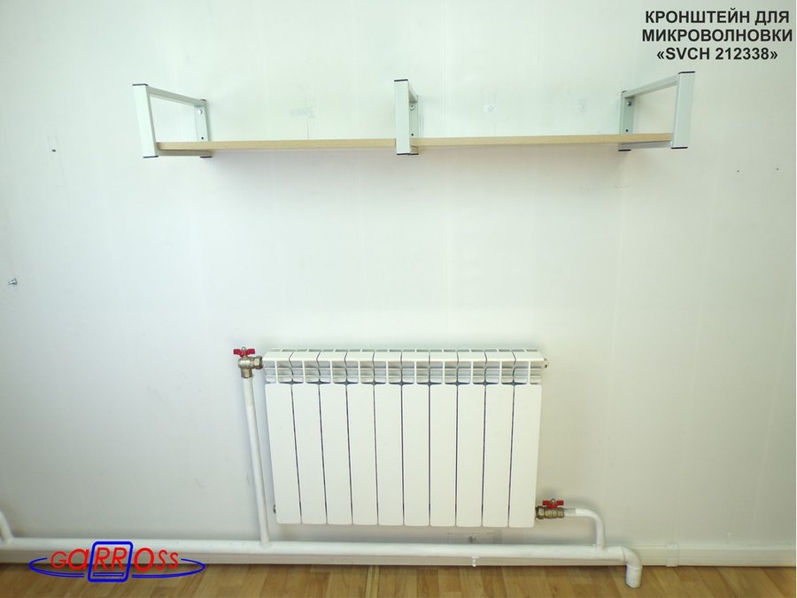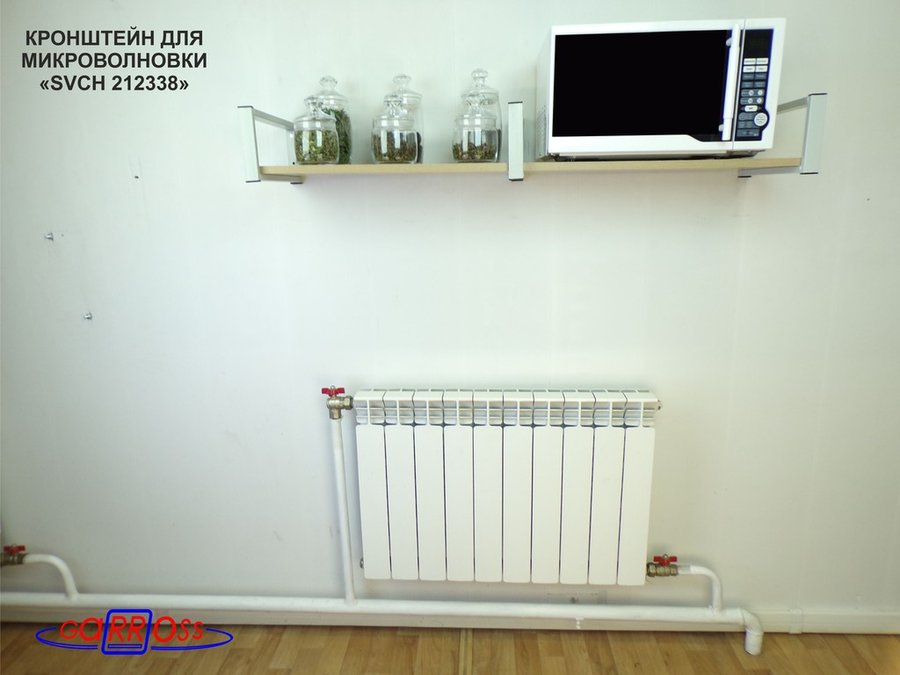 • Полка надежно крепится к стене при помощи анкеров или шурупов с дюбелями, на ней можно разместить микроволнрвую печь, кухонную технику, посуду, специи
