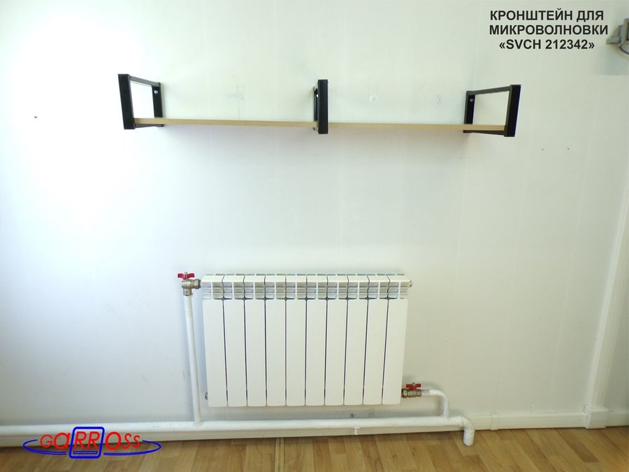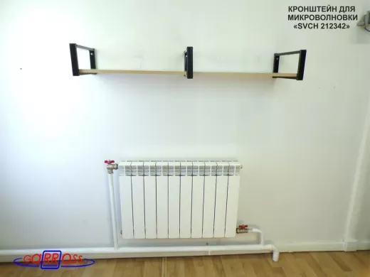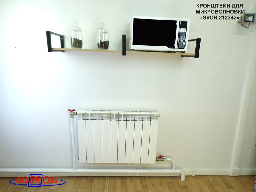 • Полка надежно крепится к стене при помощи анкеров или шурупов с дюбелями, на ней можно разместить микроволнрвую печь, кухонную технику, посуду, специи
